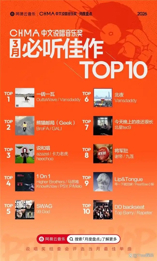 「网易云音乐·2026年3月中文说唱音乐奖月度盘点」完整名单